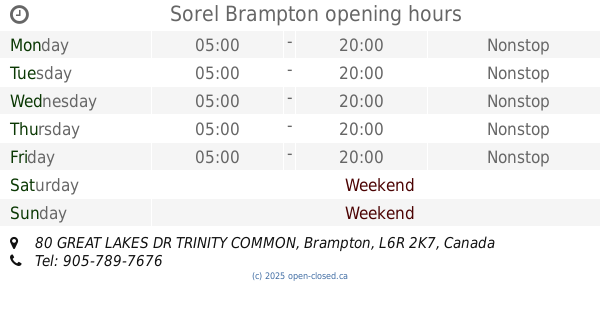 It is also possible to : Edit these OPENING HOURS of Store Sorel In Brampton, 80 GREAT LAKES DR TRINITY COMMON,